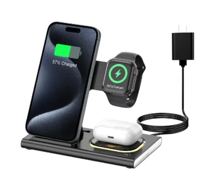 Aresh 3-in-1 Foldable Wireless Charging Station for Apple – Fast Charging Dock for iPhone 17/16/15, Apple Watch 11/Ultra 2 & AirPods Pro – Travel-Friendly with LED Nightlight