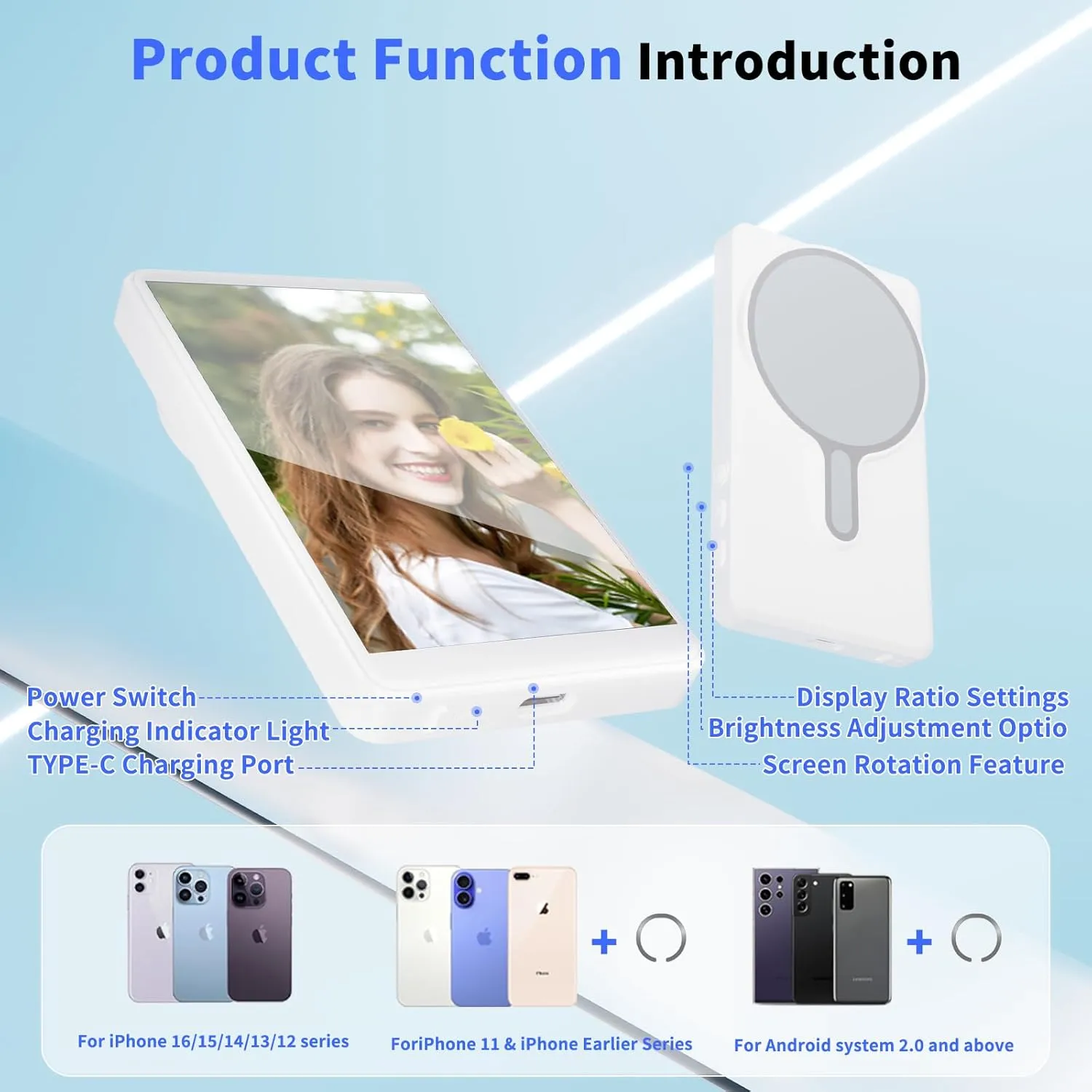 FMC Wireless Magnetic Selfie Monitor – 4K 30fps Real-Time Phone Mirroring Screen with Bluetooth Remote – Use Back Camera for Pro Vlogs & TikTok – iPhone & Android Compatible